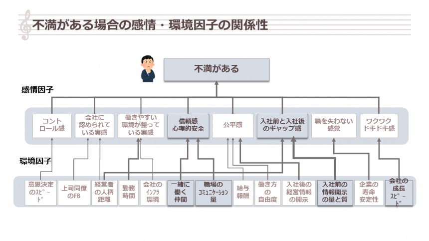 反対に、不満につながる感情因子と環境因子の関係はどうでしょうか?