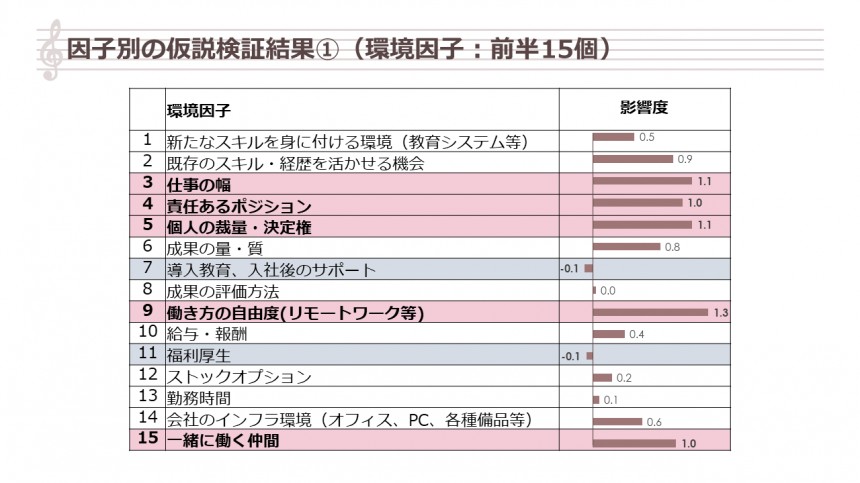 結果として、30代以下の若い年代になればなるほど、仕事の幅やインフラ環境、働く仲間、会社の成長フェーズという因子から、良い影響を受けて満足度が高まる傾向が見られます。