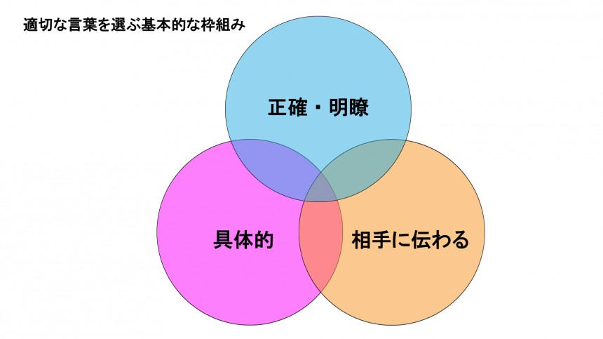 適切な表現をすべく、極力「正確・明瞭」「具体的」「相手に伝わる」の3つの円が重なり合う言葉を選ぶように意識しましょう。
