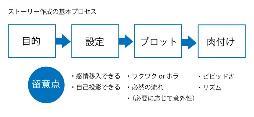 まずは目的や伝えたいメッセージを意識し、感情移入できる設定をつくります。そのうえで、ワクワクできるストーリーとするのか、それともホラーストーリーにするのかを考えます。そして因果関係を意識しつつ、「ほら、こうなるよね」という必然的流れを構成します。
