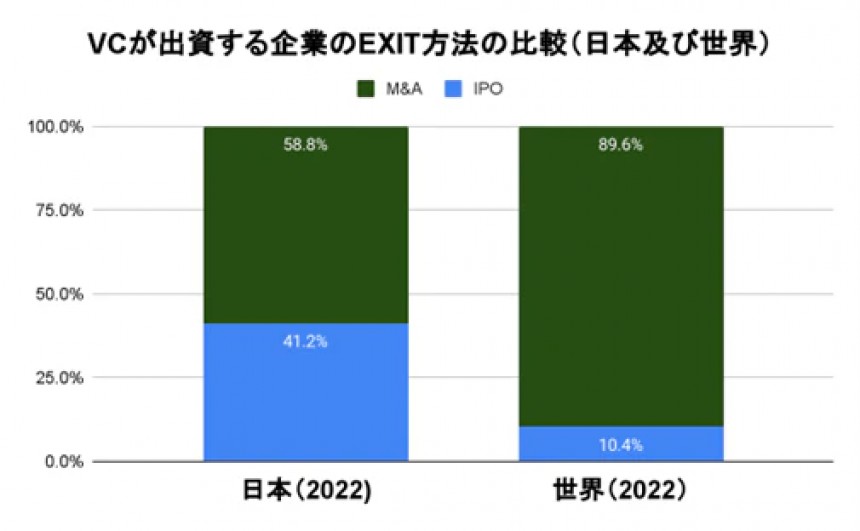2022年で比較すると、日本以外の国でのVCが出資する企業のエグジットの約9割がM&Aである一方で、日本の場合は約6割弱と、IPOでのEXITが好まれる傾向があると言えるでしょう。日本においてIPOでのEXITが多い背景としては、IPOのハードルが低いという理由以外にも、IPO以外のEXIT方法がない、すなわち、スタートアップを積極的に買収してEXITを促進する買い手(特に大企業)が少ないことが挙げられます。