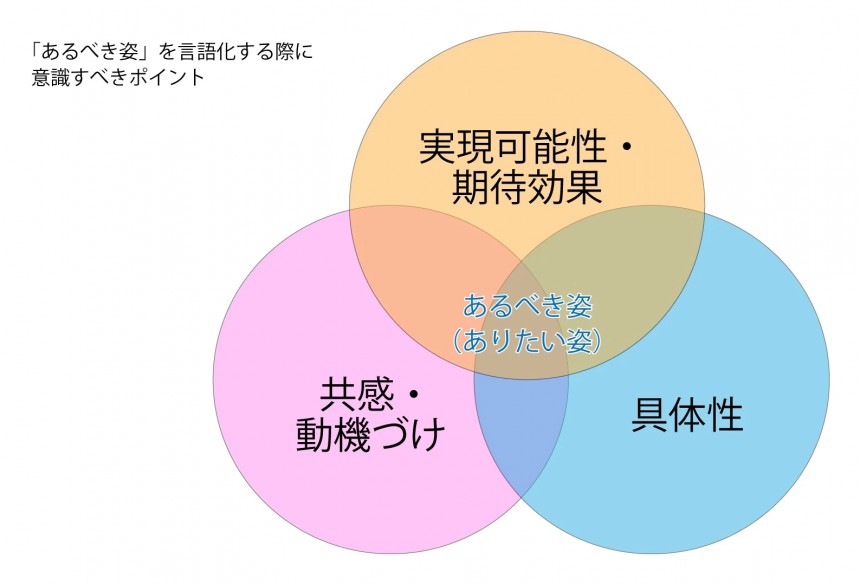 あるべき姿の言語化にあたっては、図に示したように大きく3つの要素を強く意識します。ほどほどのストレッチ感があり、みんなが「この状態を目指してみたい」と思える像を、まずは頭の中にビビッドにイメージすることが効果的です。