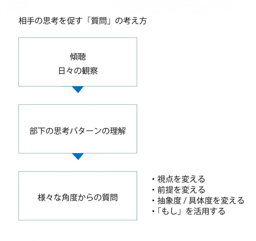 質問はあまりに誘導的すぎると効果的ではありません。相手の創造性を開放すべく、勝手に置いている前提に気づかせる質問や、新しい角度からの思考を促すような質問をすると、部下の能力も伸びますし、上司すら気づいていなかったアイデアが生まれたりするのです。