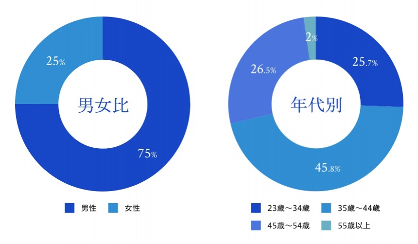 下図はグロービスの2024年度入学者数(N:977名)について、性別と年齢の内訳を示したものです。ご覧の通り、70%を超える方々が35歳以上、45歳以上が28.5%にも上ります。多くの日本企業では管理職への昇進前後を境目として体系的な経営知識が実務上必要となる度合いが増し、そのタイミングは35歳以降のケースが多いと考えると、この数字も納得感があります。