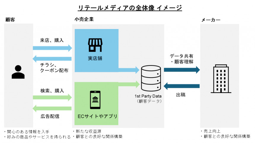 顧客の1次データを保持し、ECサイトや実店舗によって接点を持つ小売企業にとって、リテールメディアは新しい収益源として期待されています。