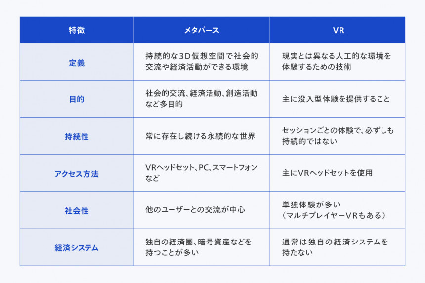 メタバースとVR(仮想現実)は密接に関連していますが、同じものではありません。両者の主な違いは以下です。