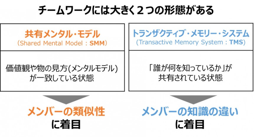 このように、チームワークには、「チーム一丸」となる状態だけでなく、ノウフー(「誰が何を知っているか」の情報)を通じてお互いの違いを活かす、TMSという形があります。