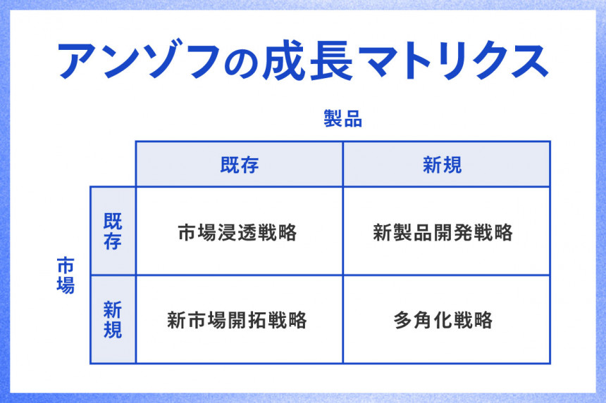 「アンゾフの成長マトリクス」とは、経営学者イゴール・アンゾフが提唱したフレームワークです。企業が「どのような製品・サービス」を「どの市場」に投入するかを既存・新規からなる4つの組み合わせで分類し、成長戦略を整理したものです。