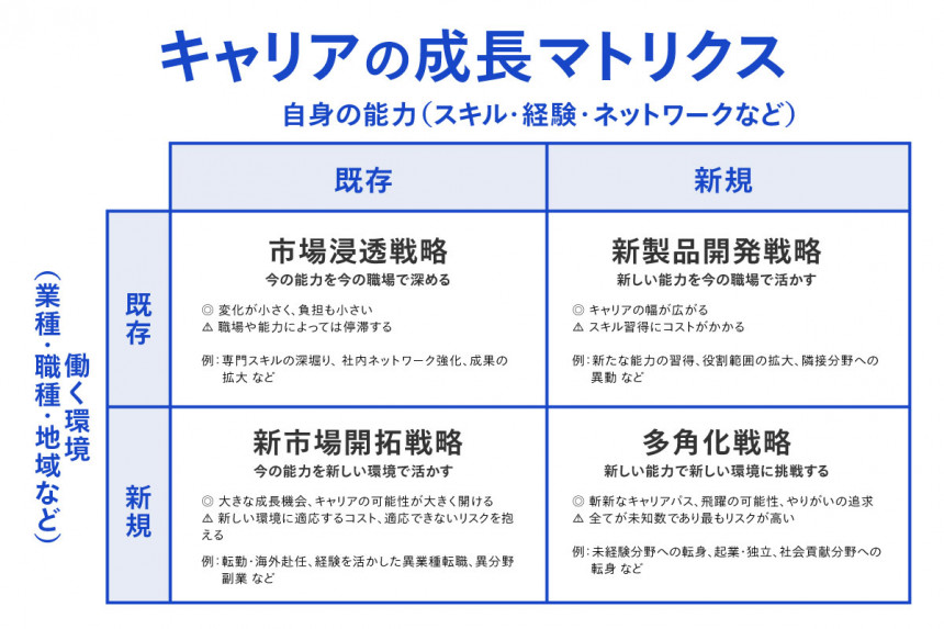 新しい環境への適応が求められるため、市場浸透よりはリスクがありますが、同時に新たな成長機会が得られキャリアの可能性が広がる未来にもつながります。