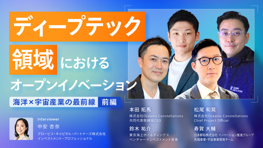 OC社は海を起点としてどのような未来を描いているのかー今回はディープテックにおけるオープンイノベーションをテーマに、OC社が協業を進める日本郵船様・東京海上様も交えて取り組みや想いを伺います。聞き手はグロービス・キャピタル・パートナーズの中安杏奈。