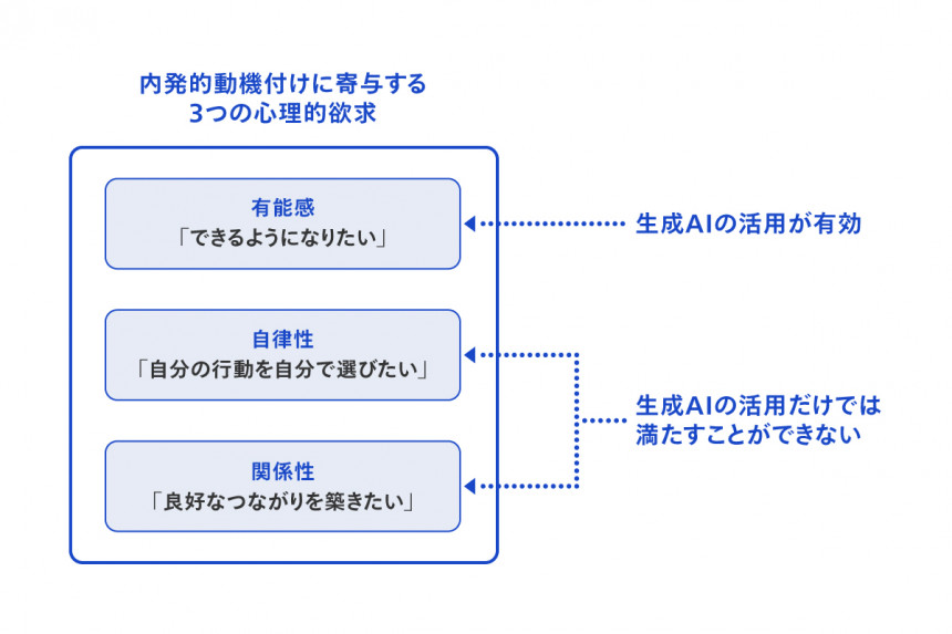 一方で、生成AIの活用だけでは、自律性や関係性といった他の欲求を満たすには限界があると、Chiuの研究は指摘します。生成AIは便利な道具である一方で、学習者が自ら試行錯誤する機会を奪い、「自分のやり方で納得いくまで考える」といったプロセスを妨げる恐れもあります。自律性を育むためには、学習者が自分で選択肢を探りながら進める余地を残す必要があります。
