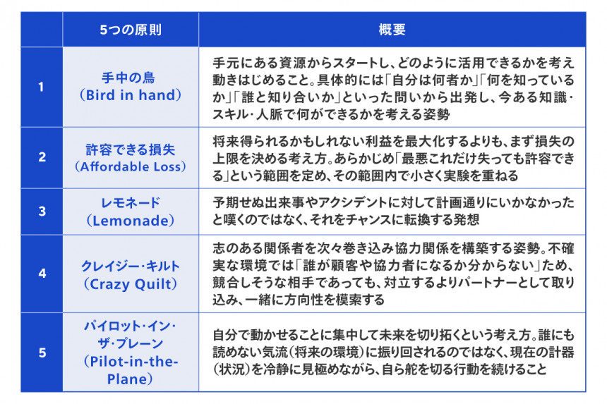 これは、起業家が使う「手持ちの資源を起点に、予測ではなく行動で未来を切り拓く」思考法であり、手中の鳥、許容できる損失、レモネード、クレイジー・キルト、パイロット・イン・ザ・プレーン という5つの原則で整理されています。