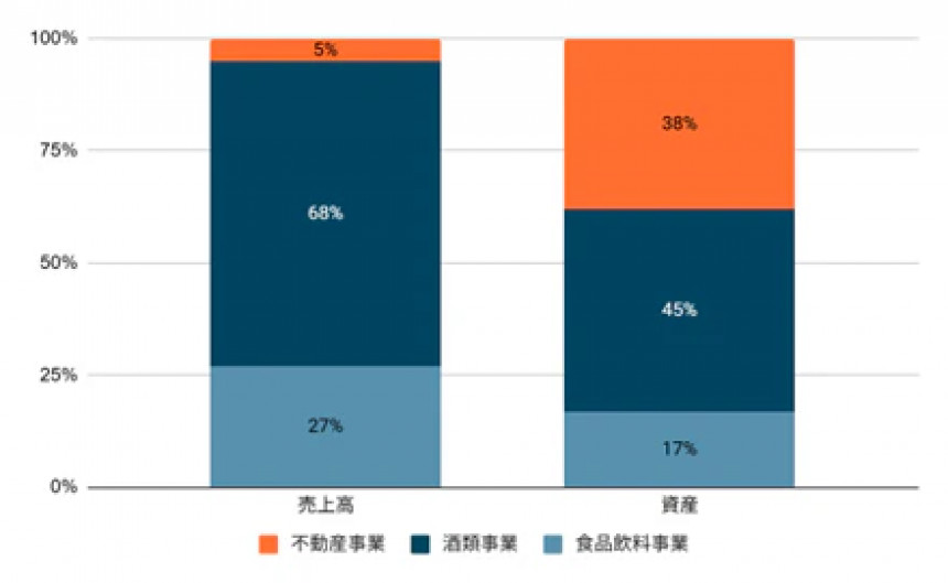 事実、表2の通り不動産事業は売上高に占める割合に比べて資産に占める割合が大きくなっています。不動産事業の総資産回転率が0.11倍に対して、酒類事業や食品飲料事業は概ね1.2倍前後となっており、不動産事業が総資産回転率を低めているといえます。
