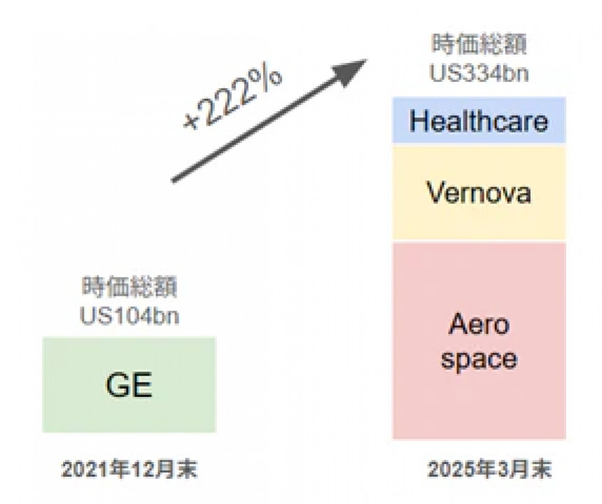 2021年末時点のGE本体と分割三社の2025年3月末時点の時価総額を比較して、時価総額の伸び率を計算すると222%となります。同期間のS&P500の伸び率は約17.1%なので分割された3社の伸び率の大きさが分かります。