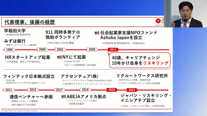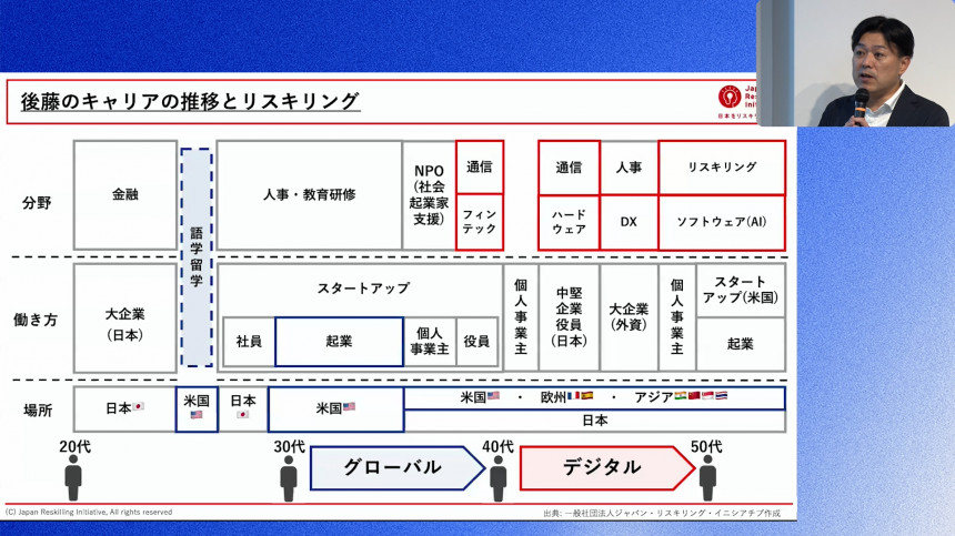 後藤:現在、私はリスキリングに関する政策提言や、企業向けの導入支援を行っています。実は40歳になるまで、私は非ITの世界で働いていました。そこから一念発起して、少しずつデジタルやソフトウェア、ハードウェアの分野に関わるようになり、今ではAI領域でスキルの可視化を行うプラットフォーム事業を日本で展開したり、ジャパン・リスキリング・イニシアチブという非営利団体で活動したりしています。