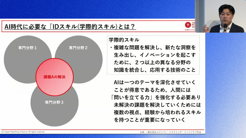英語ではこれを“Interdisciplinary Skills”と呼びます。異なる分野の知識や経験を組み合わせて、複雑な課題を解決し、イノベーションを生み出す力です。今までの経験で培ったスキルに、新しいスキルを掛け合わせてどう新しい価値を生み出すか。この視点でリスキリングやキャリア設計を考えることが、これからの時代には非常に重要になると考えています。