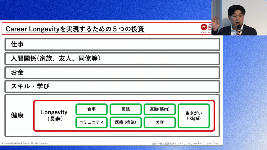 私はこの「ロンジェビティ・スキル」を、単なる健康管理だけでなく「長く健康に生きるための具体的な行動知識・習慣」として定義しています。例えば、食事・睡眠・運動・人とのつながりに加え、自分が病気になるリスクや、病気になったときに必要な医療の知識、さらには美容も含まれます。そして最も重要なのが「生きがい」。これは日本の百寿者に共通するキーワードであり、キャリアの持続性とも深く関係しています。