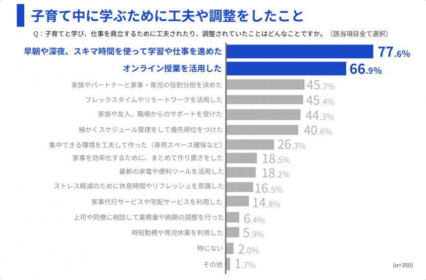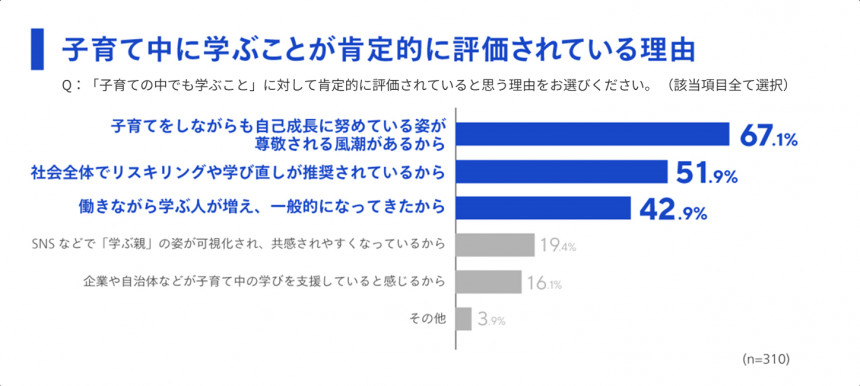子育て中は、「今は我慢する時期」と捉えてしまいがちです。しかし今回の調査結果は、学びが何かを犠牲にする行為ではなく、今の生活を前提にしながら、人生やキャリアの可能性を少しずつ広げていくための、一つの現実的な選択肢になり得ることを示しているのではないでしょうか。