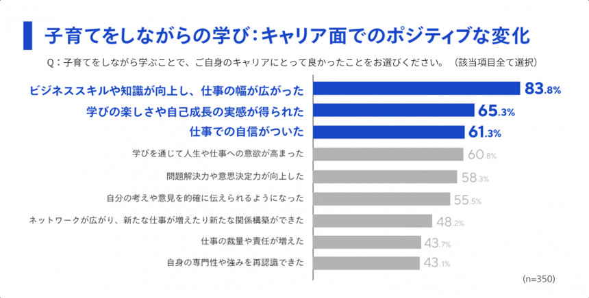 企画段階から、調査の背景や設問設計について意見を交えながら関わってきましたが、今回の調査を通して、子育て中という多忙な時期においても、学びに取り組むことがキャリア形成や自己成長に前向きな変化をもたらしていることが確認できました。