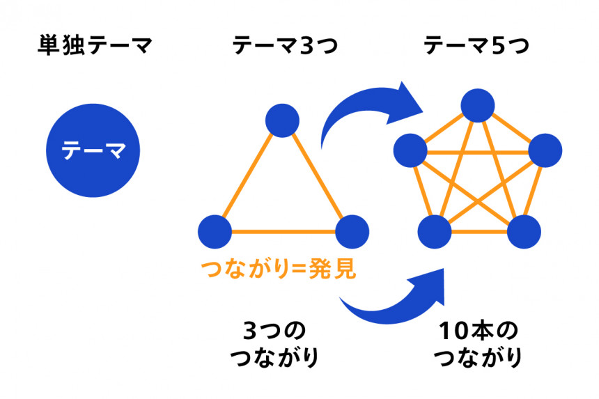 学んだテーマがひとつだけであればテーマ「間」のつながりは当然ゼロですが、テーマがふたつになればつながりがひとつでき、テーマが3つに増えるとつながりは3つに増える。たとえば、ファイナンスに関する知識がマーケティングの授業で学んだ理論によって肉づけされ、それが人材マネジメントに関する課題にひらめきをもたらしてくれるようなイメージです。さらに、テーマが4つになればつながりは6つ、テーマが5つに増えればつながりは10…と、多彩な学びが積み重なるにつれて、そこから得られる発見、すなわち成長のための気づきは飛躍的に増えていくため、学びに投資する期間を長くとれば、そのぶんだけ新たな学びから得られる成長が加速していくことになります。(MBAを取得した人の多くが、ビジネススクールにおける学びは初年次よりも2年めのほうがはるかに大きかったと口にする要因のひとつは、ここにあります。)