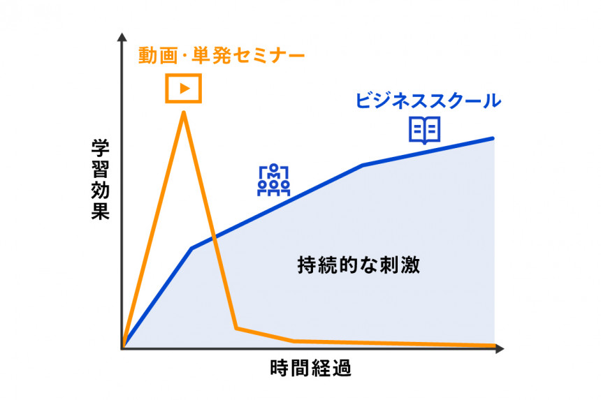 ※2 言わずもがなのことではありますが、これは動画やセミナーが悪いという意味ではありません。(事実、グロービスでは、多くのビジネススクール以上に豊富な動画教材やセミナーの機会をご提供しています。)ここでの要点は、定式化されたフォーマットやトーンで短時間情報に触れる「だけ」なのと、ビジネススクールで複合的かつ継続的な形で学びに取り組むことには、成長という点において決定的な違いがあるということです。