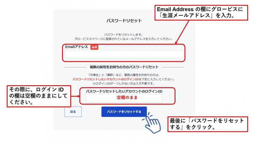 【3】「パスワードリセット」画面にて、空欄一段目「Emailアドレス」に「生涯メールアドレス」を記入し、「パスワードをリセットする」をクリック