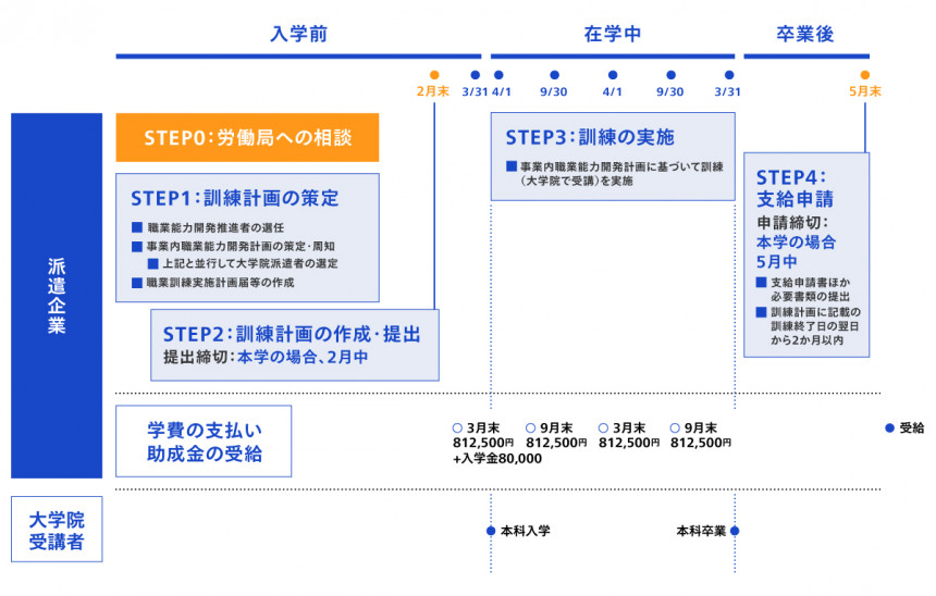 - 大学院のような長期助成の場合、経費助成と合わせて賃金助成が適用される場合もありますが、適用の可否は労働局へご確認ください