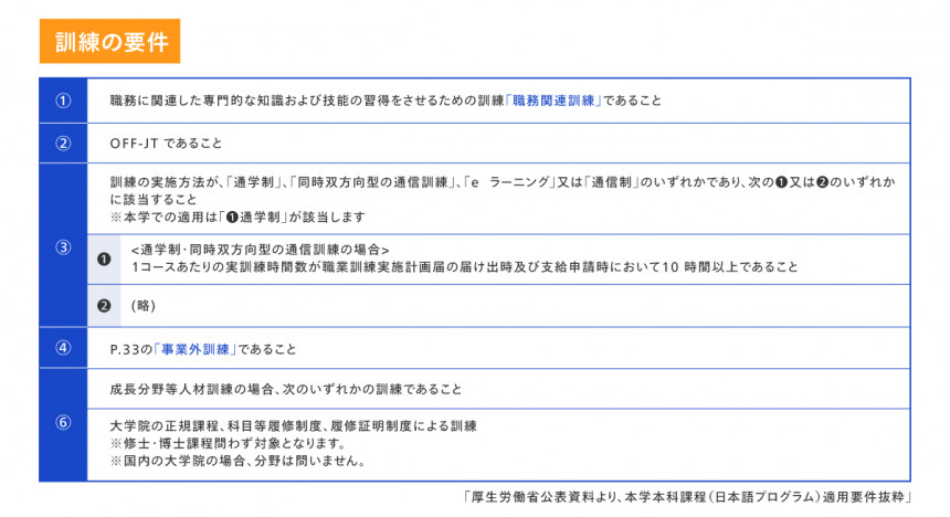 本学は下位に記載の「訓練の要件」のうち、『職務に関連した専門的な知識および技能の習得をさせるための訓練「職務関連訓練」であること』を除くその他の必要な要件を満たしています。