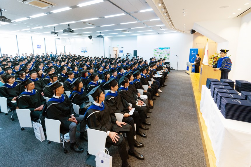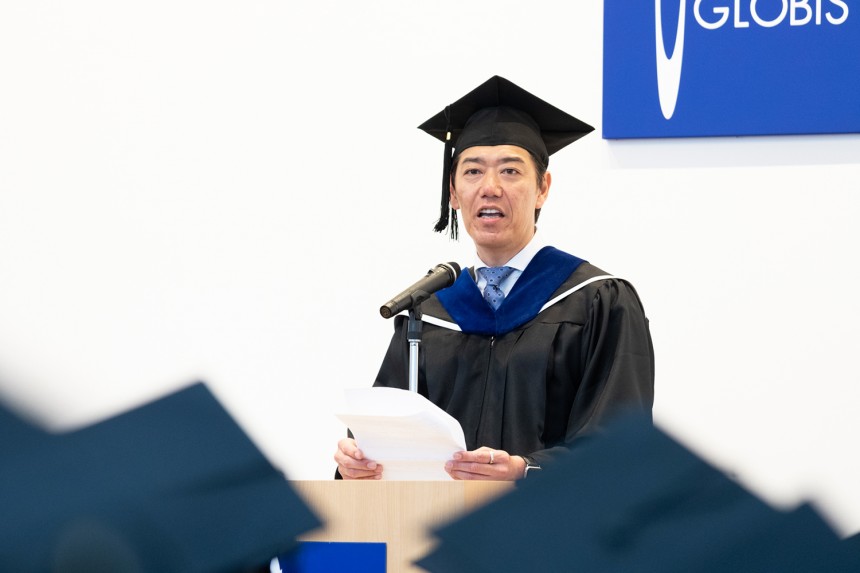 「令和の時代は、テクノロジーの進化が世の中を大きく変えていきます。皆さんは、グロービスで身に付けた経営の能力とテクノロジーの進化を組み合わせながら、常識を打ち破り、自らの可能性を信じて挑戦を続けてください。その先には素晴らしい人生が待っていることでしょう」