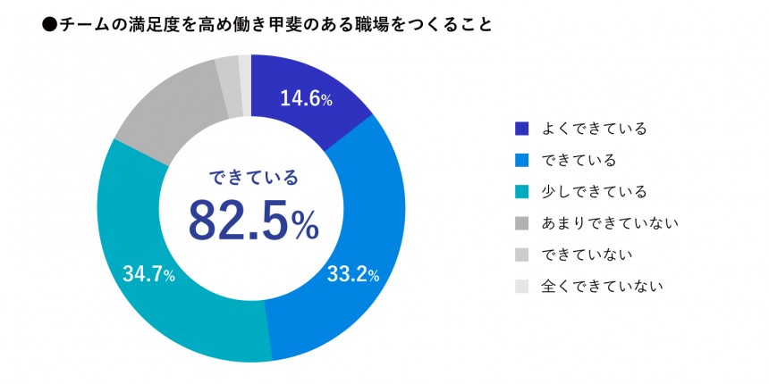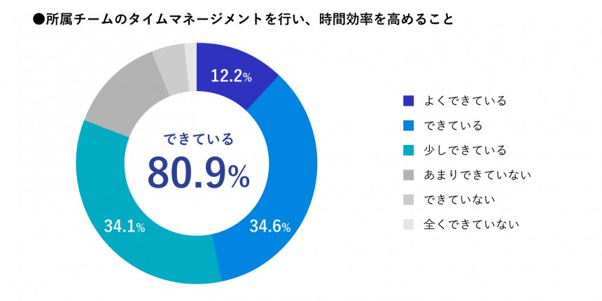 所属しているチームの働き方に関する設問では、「タイムマネージメントを行い時間効率を高められている」と回答した人は回答者全体の80.9%を占めています。加えて、「満足度を高め働き甲斐のある職場をつくれている」と回答している人は回答者全体の82.5%と、グロービスのMBAが自身の能力開発だけでなく、所属チームの働き方にも良い影響を与えていることが窺えます。