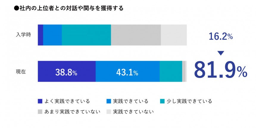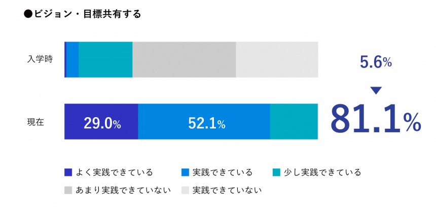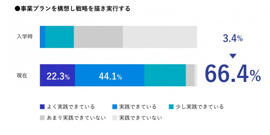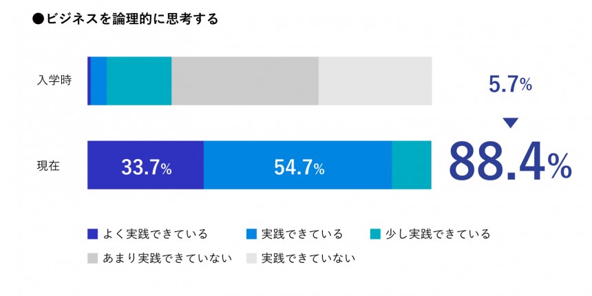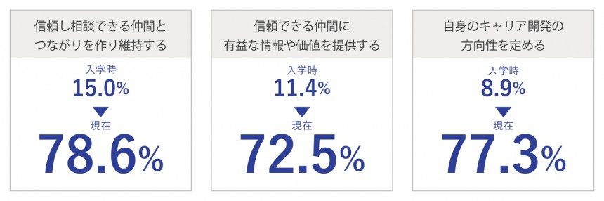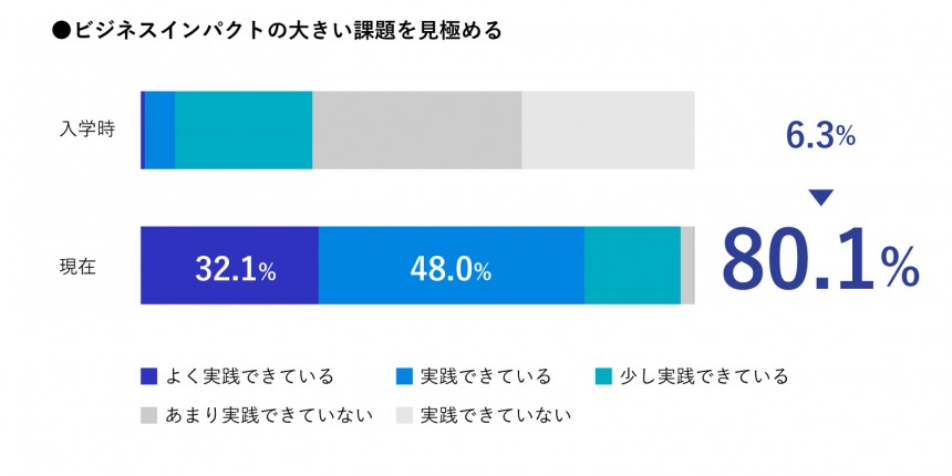 思考にかける時間の短縮と判断軸が増加した。 また、コミュニケーションを取る際に相手の意図を汲みやすくなった。 これはビジネスへの理解度と想像力が高まり、組織と個々人の役割は何かということを意識しながら話せるようになったのが大きな要因だと考えている。 営業成績が入学式前より3割増になった。