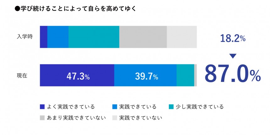 また、「学び続けることによって自らを高められている」割合も18.2%から87%に大幅に増加しており、グロービスの卒業生に学び続ける習慣が定着している様子が確認できます。