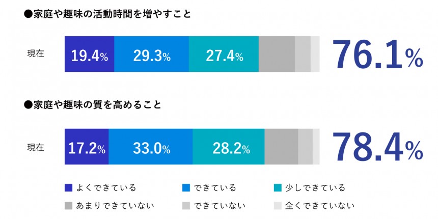 加えて、仕事以外においても明確な変化を見てとれます。「信頼し相談できる仲間とつながりを作り維持することができている」割合は15%から78.6%に、「信頼できる仲間に有益な情報や価値を提供できている」割合は11.4%から72.5%に、「自身のキャリア開発の方向性を定められた」割合は8.9%から77.3%に増加しています。また、「家庭や趣味の活動時間を増やすことができている」割合は回答者全体の76.1%、「家庭や趣味の質を高めることができている」割合は78.4%と、グロービスのMBAが仕事も含めて人生をより豊かにしている様子も見てとれました。