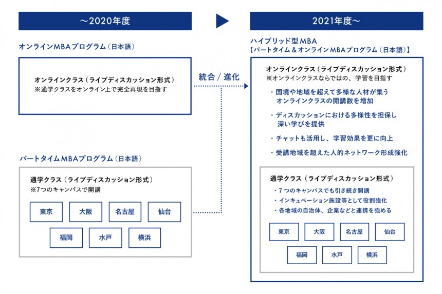 グロービス経営大学院は、オンライン上のコミュニケーションが一層重要となる新しい生活様式に合わせて、開学15周年となる2021年度より、現在のパートタイムMBAプログラム(日本語)、オンラインMBAプログラム(日本語)の2つのプログラムの垣根を撤廃し、パートタイム&オンラインMBAプログラム(日本語)に統合。両MBAプログラムが融合したハイブリッド型MBAとしてプログラム形態が進化します。