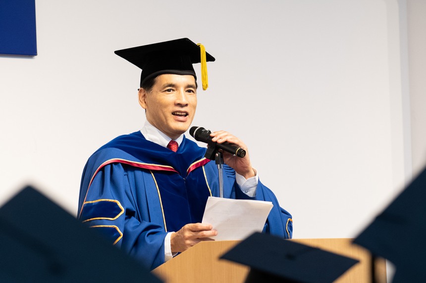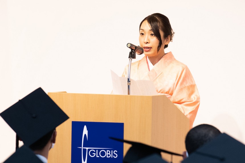 「これからの時代は、テクノロジーの進化が世の中を大きく変えていきます。皆さんは、グロービスで身に付けた経営の能力とテクノロジーの進化を組み合わせながら、常識を打ち破り、自らの可能性を信じて挑戦を続けてください。その先には素晴らしい人生が待っていることでしょう」 「卒業後もグロービスで、皆さんを後押しする多くの機会を活用してください」
