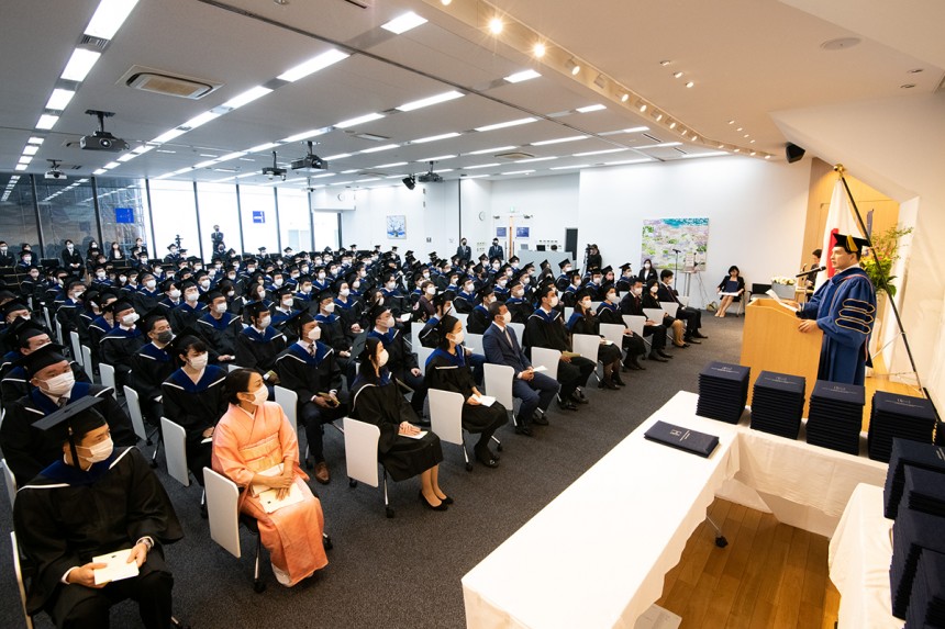 「本来であれば、この春に卒業式を開催する予定でしたが、新型コロナウイルスの感染拡大により、このタイミングでの卒業式となりました。こうしてリアルとオンラインで皆さんのお顔を拝見でき、卒業式を開催できることをとても嬉しく思っております。今年は、全校で858名の優秀な卒業生を送りだすこととなります」――この言葉から始まった学長による、卒業生へのはなむけのメッセージ。