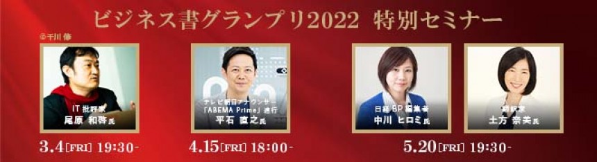 3月4日(金)より「読者が選ぶビジネス書グランプリ2022」部門賞受賞作品の著者・翻訳者・編集者らをスピーカーとしてお招きし、特別セミナーを3回にわたり実施します。