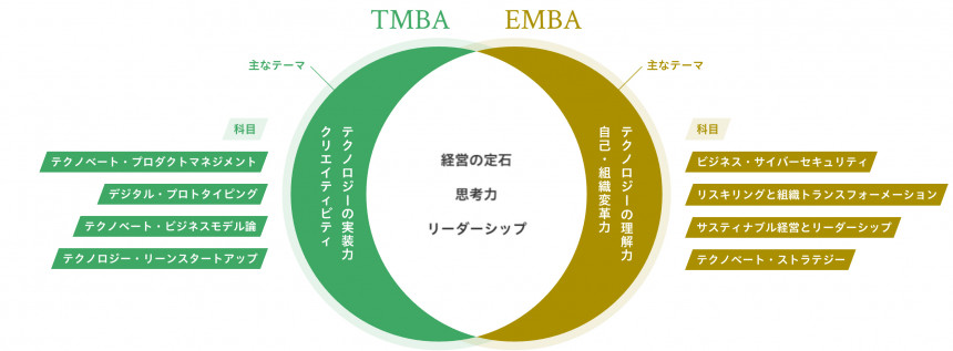 TMBAは「テクノロジーをビジネスに実装するための力」を、EMBAは「経営をリードするための力」を身に付けたいというニーズに応えます。