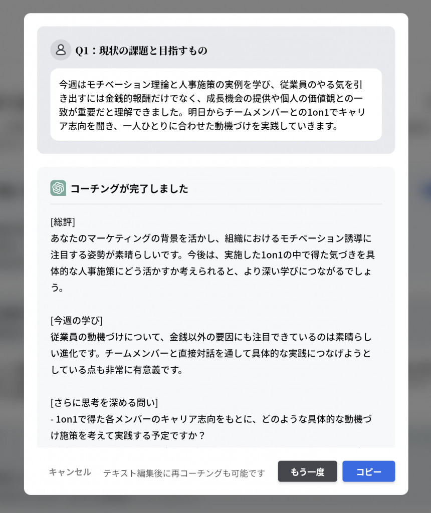 このように、表面的なアドバイスにとどまらない、「自分ごと」として受け止めやすい質の高いフィードバックが得られる点が、本機能の特徴です。受講生は、AIとのインタラクティブ(双方向)なコミュニケーションを通じて、理解を深めながら、楽しんでビジネス学習に取り組むことが可能になります。